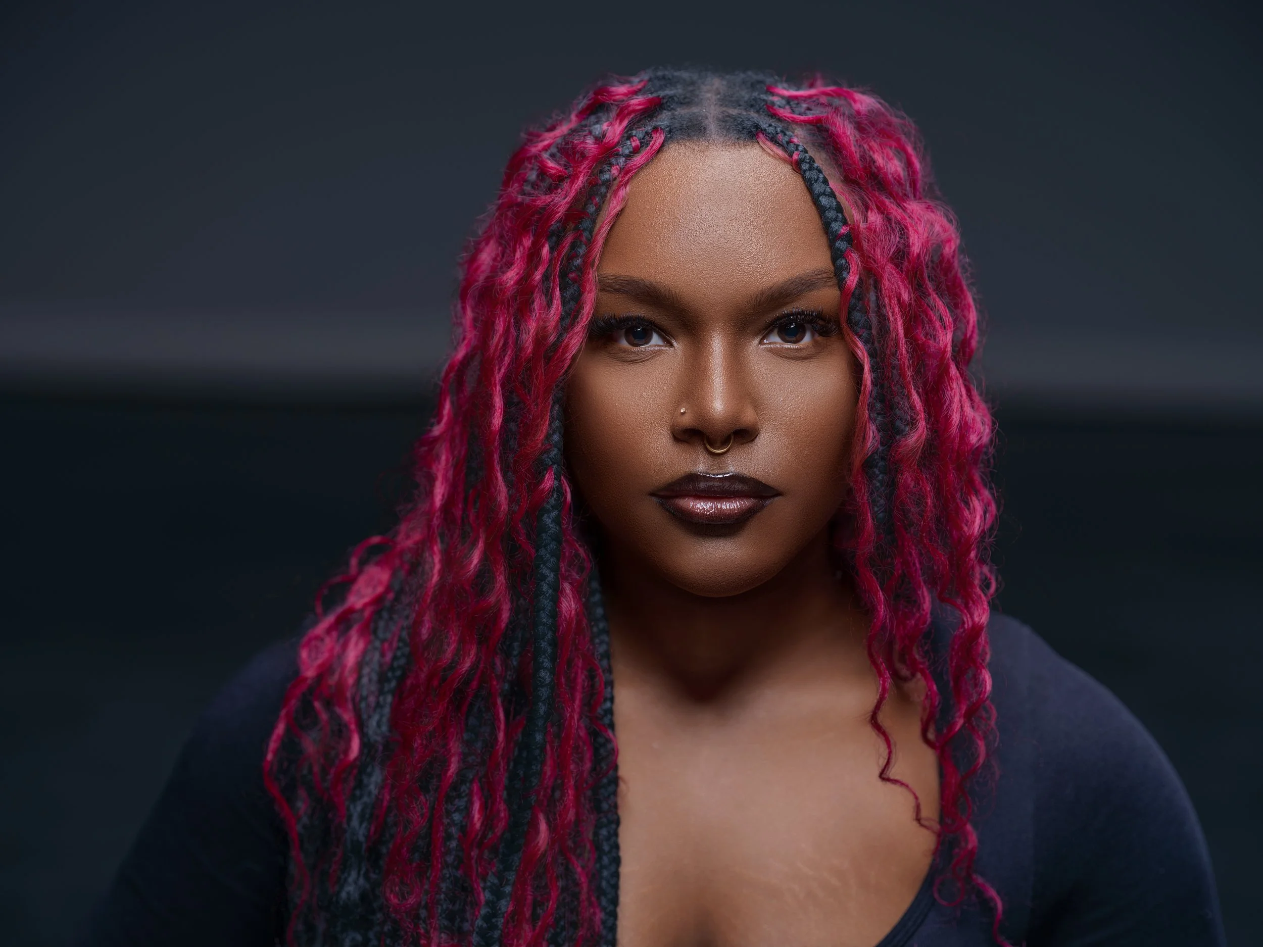 Portrait of a woman with dark skin and bright pink and black curly hair, looking directly at the camera with a neutral expression, against a dark background.